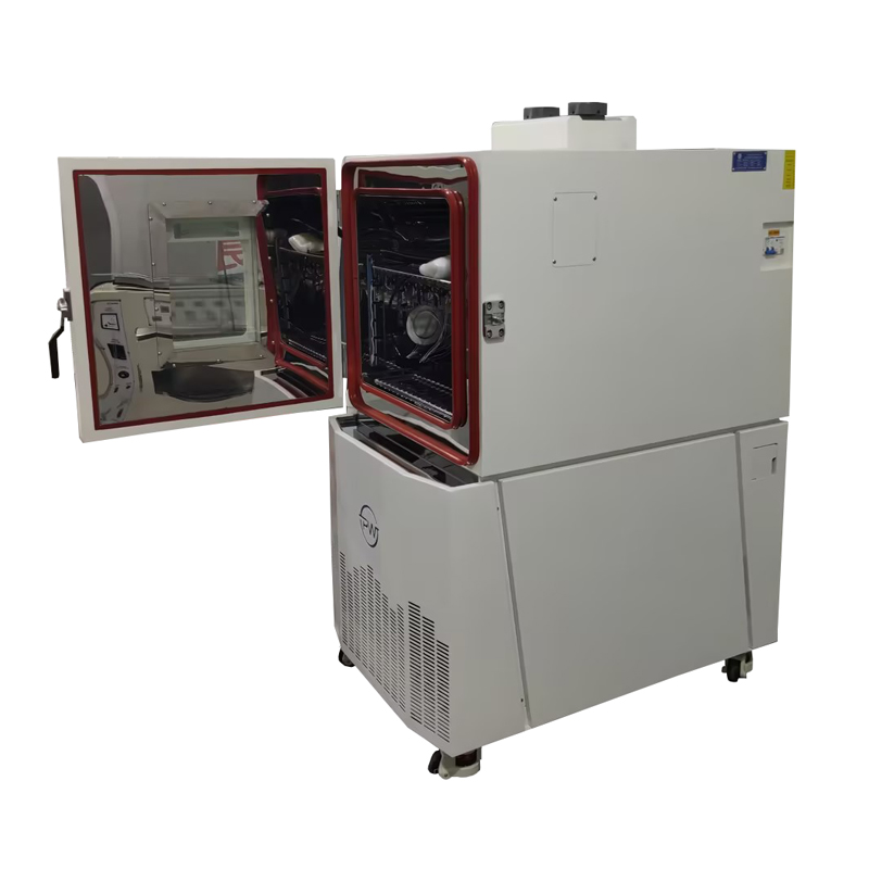 a、采用冷平衡系統,長時間運行不結冰,滿足所有膠帶在不同溫濕度下的持粘力測試;b、水槽用特種材料制作,導熱系數小,表面不會附水珠(如用金屬材料表面會結水珠,滴落容易打濕樣品,影響測試效果),且附有導流裝置,水槽如出現內壓力過大或水位過高時會由導流孔流入加濕桶。c、機臺精致,內部空間大,外尺寸小,寬度僅78CM左右,單門的實驗室均可輕松進入。d、頂部附有泄壓孔。