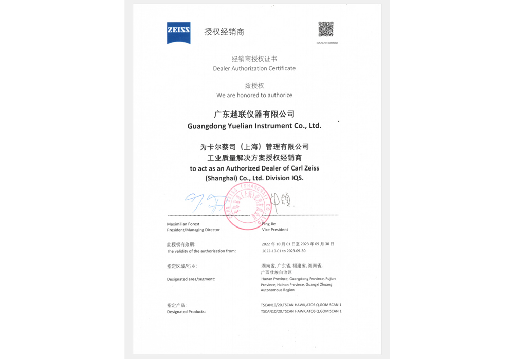 蔡司經(jīng)銷商授權(quán)證書