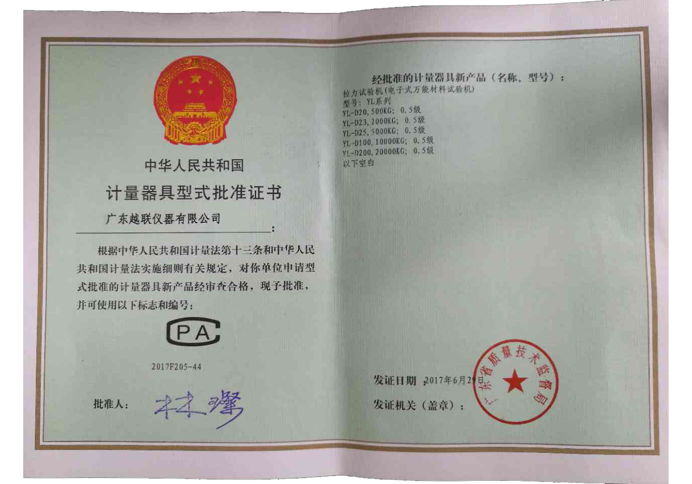 計量器具型式批準(zhǔn)證書